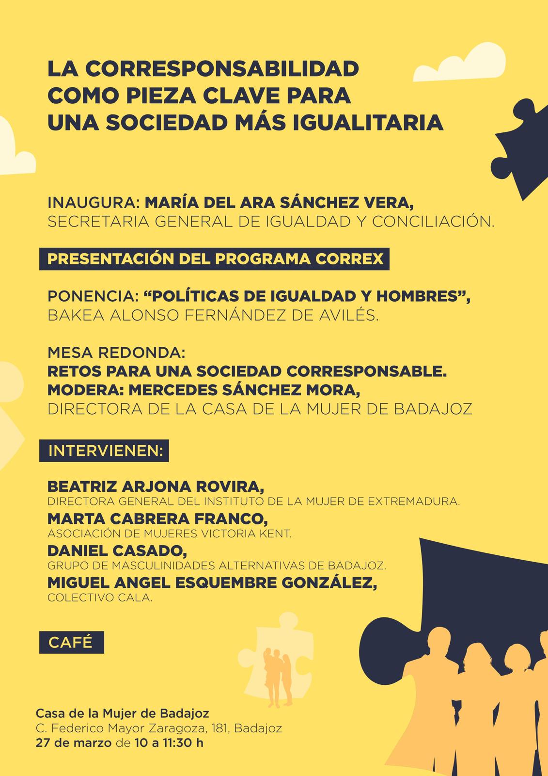 En la jornada participaron las entidades que están desarrollando el proyecto Correx en Extremadura, financiado con cargo al Plan Corresponsables, entre ellos, el psicólogo Jesús Moreno Pizarro, de la Fundación Iniciativa Social, que la ha dado a conocer, y la socióloga Bakea Alonso Fernández de Avilés, que habló sobre las `Políticas de Igualdad y Hombres'. También se celebró una mesa redonda sobre 'Retos para una sociedad corresponsable', moderada por la directora de la Casa de la Mujer de Badajoz, Mercedes Sánchez Mora, y que contó con la participación de la directora general del Instituto de la Mujer de Extremadura, Beatriz Arjona Rovira; del representante del Grupo de Masculinidades Alternativas de Badajoz, Daniel Casado; del integrante del Colectivo Cala, Miguel Ángel Esquembre González; y de la coordinadora de la Asociación de Mujeres 'Victoria Kent', Marta Cabrera Franco.
