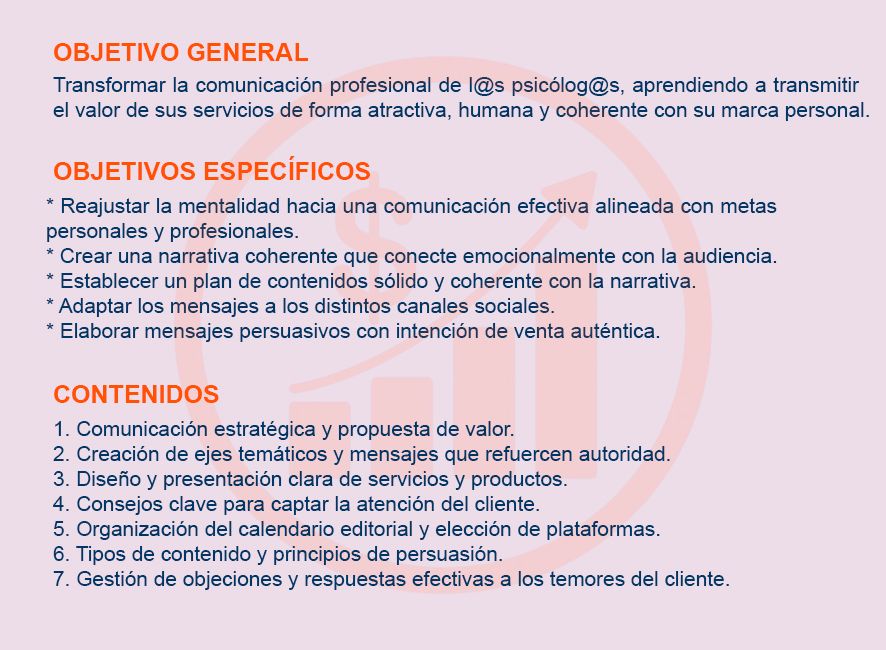 * Reajustar la mentaldiad hacia una comunicación efectiva alienada con metas personales y profesionales.