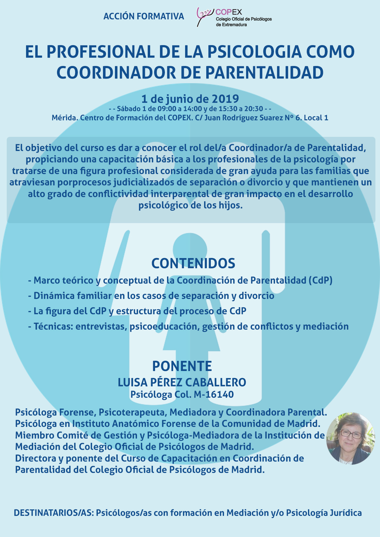 Desde el Colegio Oficial de Psicólogos de Extremadura se ha puesto en marcha esta acción formativa orientada a promover que los/as psicólogos/as mediadores/as conozcan esta nueva figura profesional, y tengan la oportunidad de capacitarse en Coordinación de Parentalidad, adquiriendo conocimientos, habilidades y herramientas de intervención con familias de alta conflictividad.