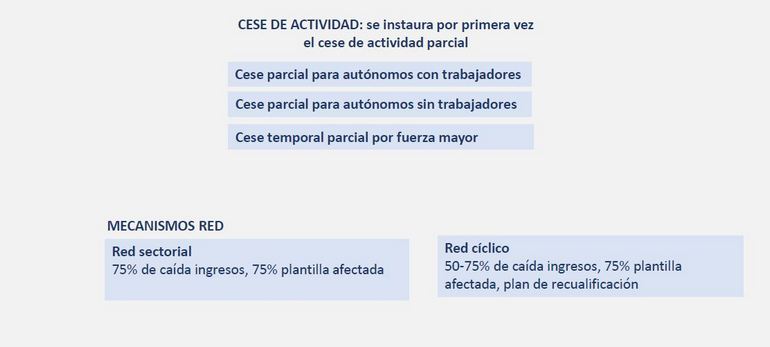 La reforma incluye una importante mejora en el esquema de protección por cese de actividad de los trabajadores por cuenta propia. Se amplían las modalidades del cese de actividad para mejorar la cobertura de distintas contingencias, como en caso de una interrupción solo parcial de la actividad, y se adapta a los autónomos la protección que proporciona a los asalariados el mecanismo RED establecido en la reforma laboral para situaciones de crisis cíclicas o sectoriales.